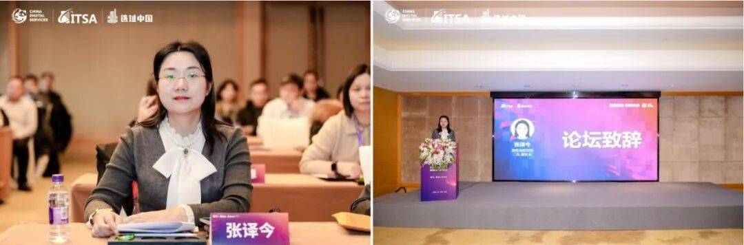 商务部服贸司二处副处长张译今女士首先为论坛致辞。她在致辞中指出,服务外包作为服务贸易的重要组成部分和数字贸易的关键实现路径,其战略地位在当前愈发凸显。她详细解读了近期国家层面出台的一系列关键政策,特别是国务院办公厅《关于加快场景培育和开放推动新场景大规模应用的实施意见》以及商务部等六部门联合发布的《促进服务外包高质量发展行动计划》,并着重强调这些政策为产业拓展了应用空间、注入了强劲动能、明确了发展目标。她呼吁产业坚持创新驱动、开放合作、标准引领、人才为本和区域协同,积极把握“十五五”规划开局之年的机遇,推动产业向数字化、智能化、融合化、绿色化方向发展。